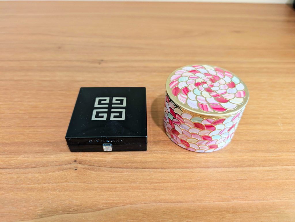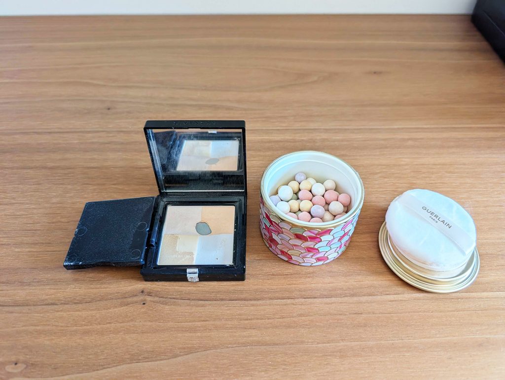 I have two powders. I have been using Givenchy for most of the last year and you can see that it is well loved. I have it in the shade 02 satin blanc. In the end of the year I got this Guerlain finishing and setting powder in pearls and I really like it. It is heavily scented, but the finish on the face is quite beautiful. It is even more lightweight that the Hourglass powders, plus it comes in this pretty packaging what is very luxurious looking. I have the shade 02 cool.