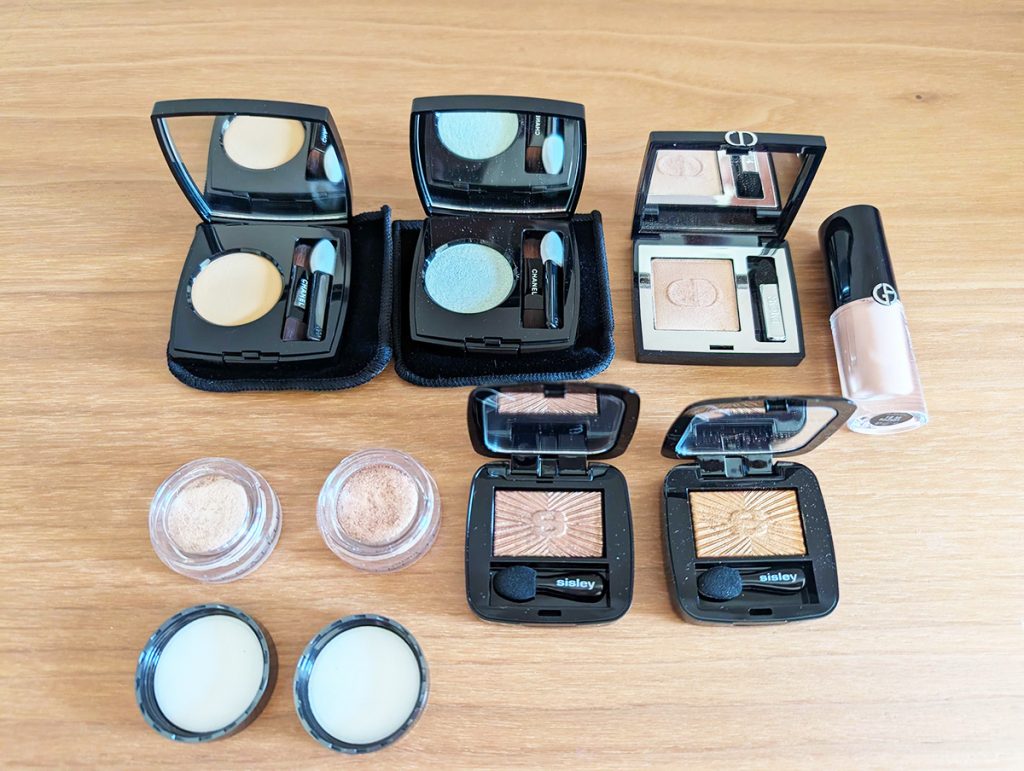 I went on a bit of a single shadow shopping spree late last year, so here are the 8 ones that are making the core of my single shadow collection. I love every one of these: Chanel in 242 Beige Suede and 222 Jade Facett, Dior in 530 Tulle, Armani cream shadow in the shade 18M, Chantecalle in Seashell and Copper and Sisley in Sparkling Topaz and Glow gold.