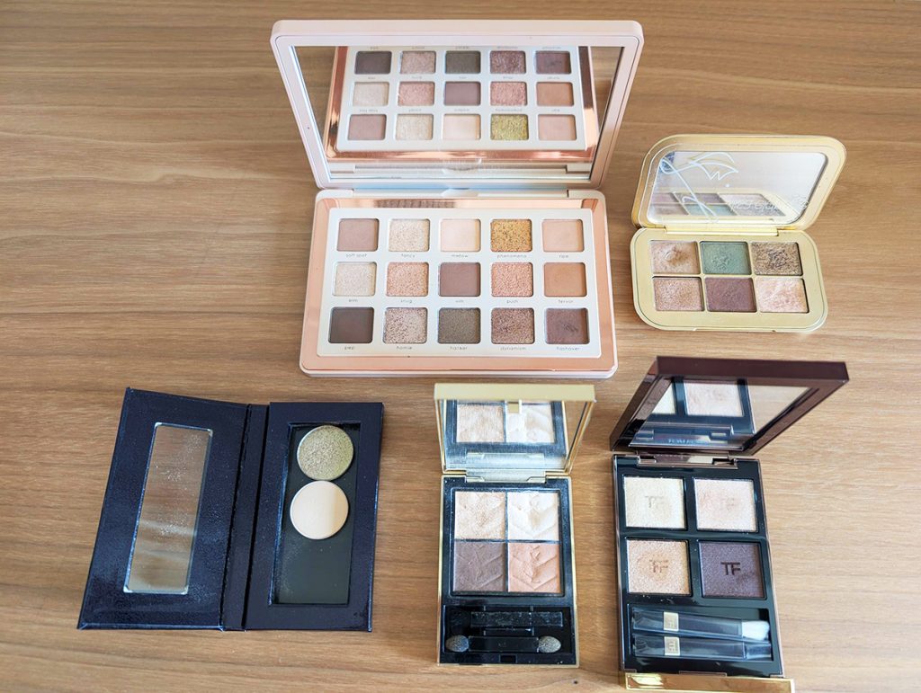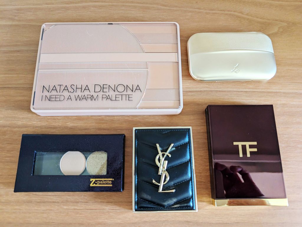 I have four eyeshadows palettes. One on the bigger side is from Natasha Denona I need a warm palette. Love it. I have three small palettes. Lisa Eldridge that I have customized and made it my own. Love all the shades, and you can see a big pan in one of the older shades in there. I got Tom Ford Peach Glamour and oh boy, it is beautiful. I love all the colors for my complexion, I love the lasting power and I feel very chic using it. The last one is YSL in the shade 300 Kasbah Spices, when I want something warm and gold. It is beautiful and love using it very much. I have only two single powder shadows and they are both from Colourpop in the shades Gnarly and Tea Garden. So, this amounts to 31 single pans of eyeshadow plus 8 single packaged eye shadows. I have 39 pans to chose from. I am really happy with this selection, collection and numbers. It is still quite a bit, but much more realistic than what I had in the previous years.